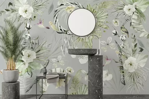Papier peint Ornement de style boho avec fleurs de pivoine et oiseaux, style aquarelle, couleurs vertes N° w03885v2