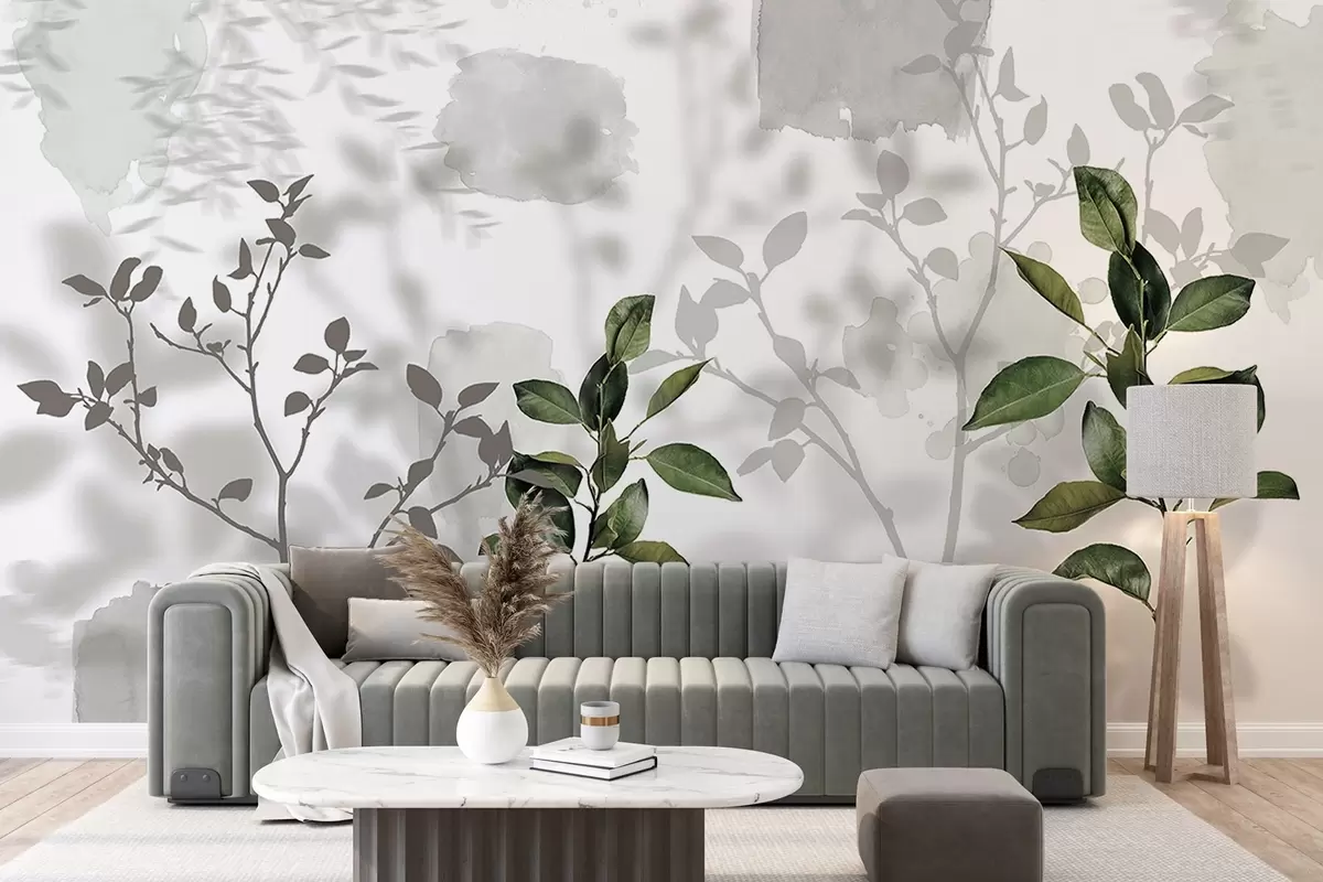 Papier peint Feuilles de citronnier, ombres des branches d'arbre, nature, aquarelle, vert N° w03910v1