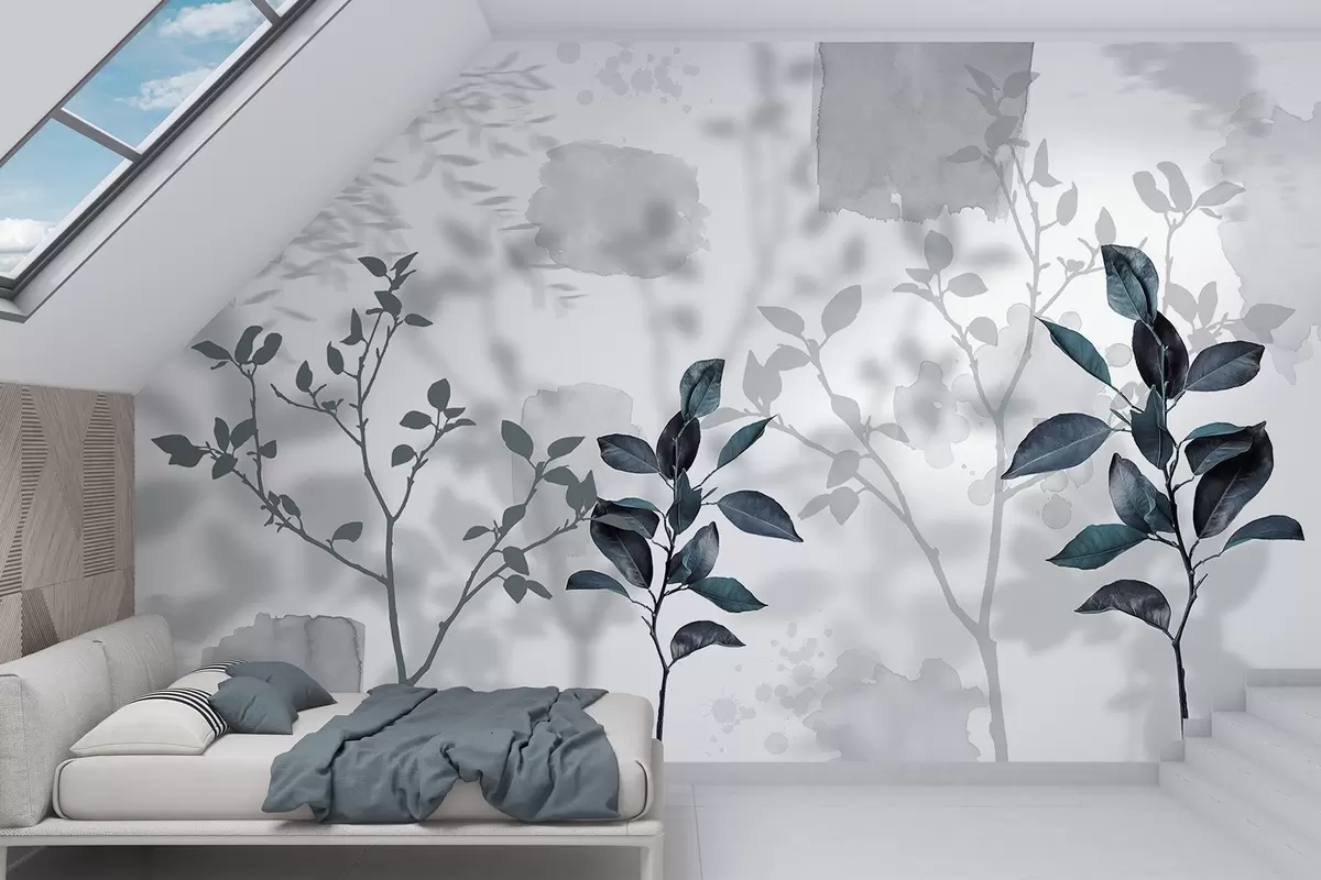 Papier peint Feuilles de citronnier, ombres des branches d'arbre, nature, aquarelle, bleu N° w03910v2