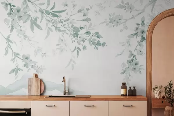 Papier peint Branches fleuries, imitation d'aquarelle, tons verts N° w03935v3