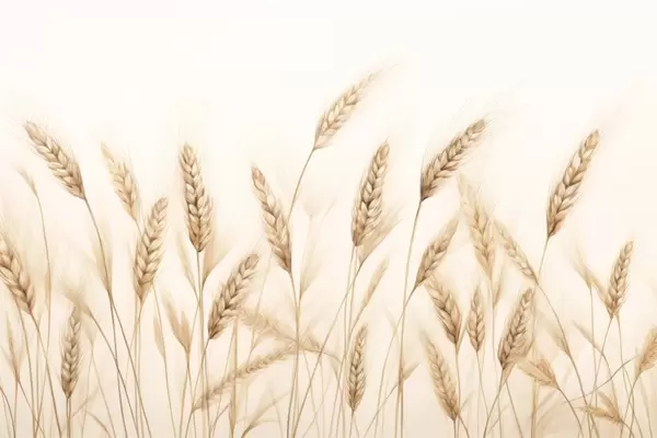 Papier peint illustration botanique délicate de tiges de blé, style dessiné à la main, lignes fines avec texture de craie pastel, tons sépia doux et brun terreux, fond blanc, composition symétrique élégante, esthétique de croquis naturel N° w03943v1