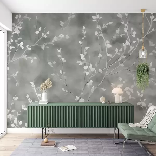 Papier peint papier peint minimaliste peint à la main représentant des branches d'arbre blanches avec des feuilles délicates, se ramifiant de manière organique sur un fond vert sauge atténué, des lignes botaniques fines dans un flux naturel N° w03949v2