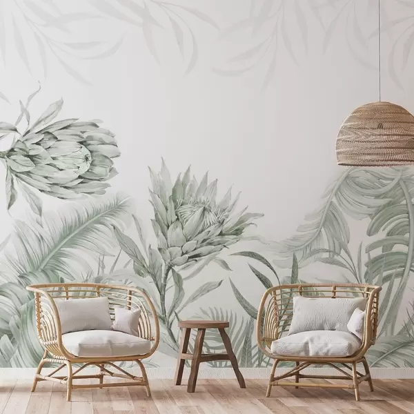 Papier peint Protea parmi des feuilles tropicales, tons bleus N° w03952v3
