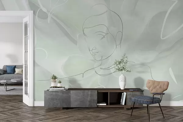 Papier peint Abstraction florale avec dessin au trait de Bouddha, couleurs vertes N° w04004v3