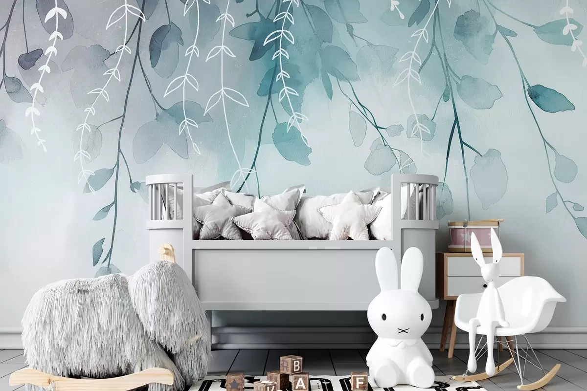 Papier peint Branches et feuilles en style aquarelle, couleurs naturelles aigue-marine N° w04007v3