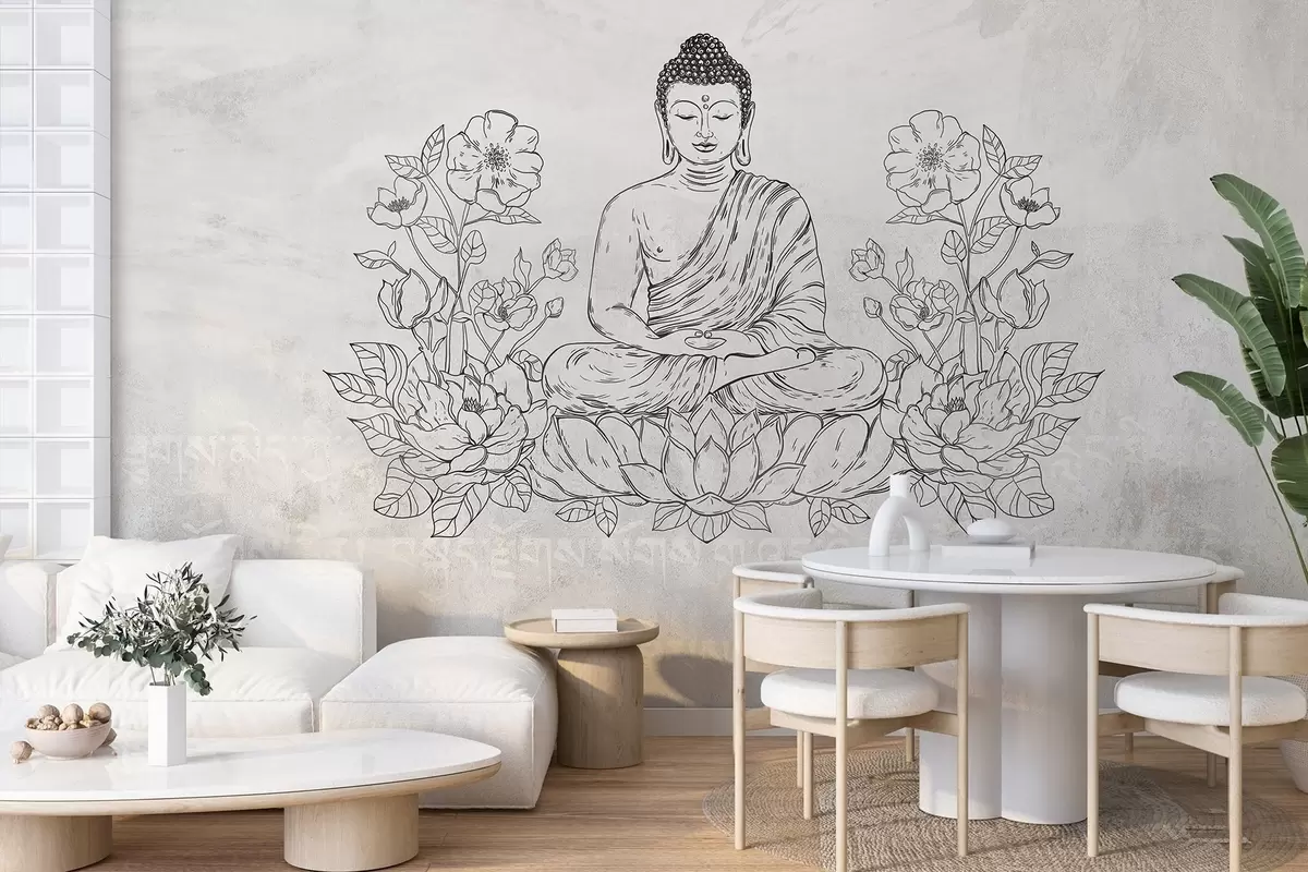 Papier peint Bouddha en méditation avec des fleurs de lotus, dessin au trait, oriental, fond beige N° w04008v1