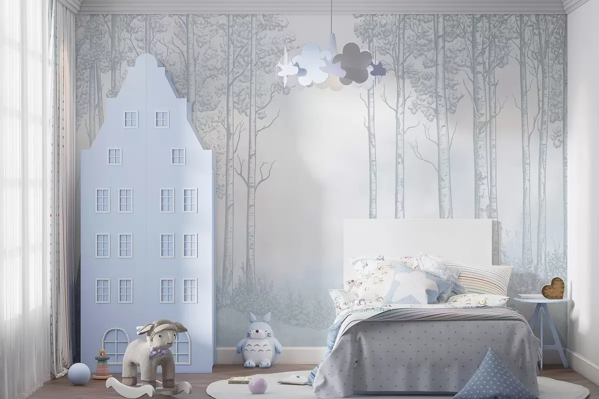 Papier peint Forêt avec bouleaux, minimalisme, nature, palette de couleurs bleues N° w04009