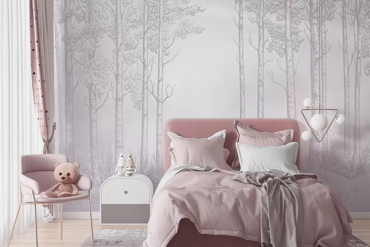 Papier peint Forêt avec bouleaux, minimalisme, nature, palette de couleurs roses N° w04009v2
