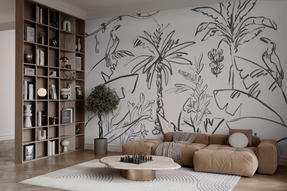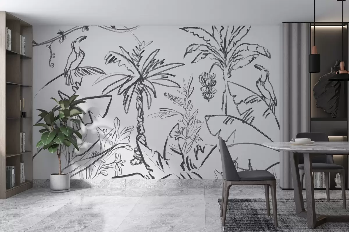 Papier peint Dessin au trait tropical, bananes, palmiers, graphiques de contour N° w04020