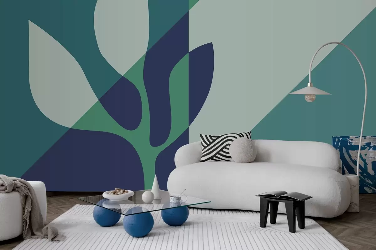 Papier peint plante graphique abstraite sur fond de géométrie dans les tons bleus N° w04028v1