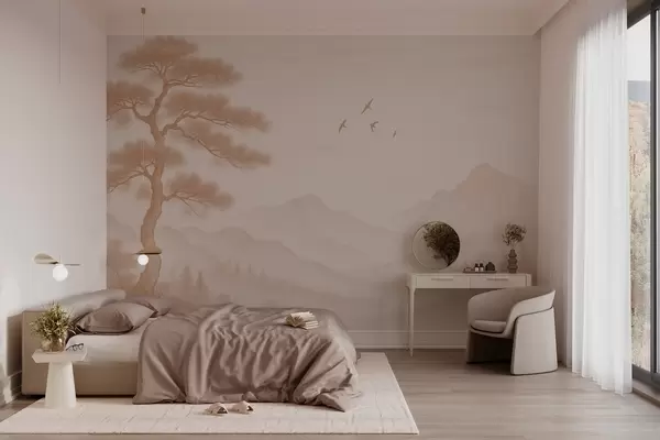 Papier peint panorama de collines avec un grand arbre dans les tons moka N° w04033v1