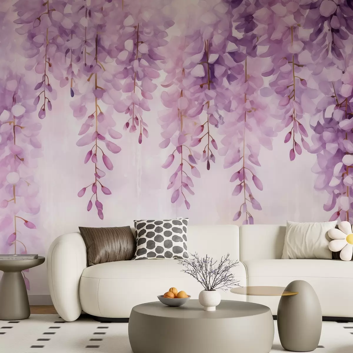Papier peint Délicate composition d'aquarelle avec des glycines en cascade dans des tons doux de lavande et de rose, créant une atmosphère paisible, N° w04034