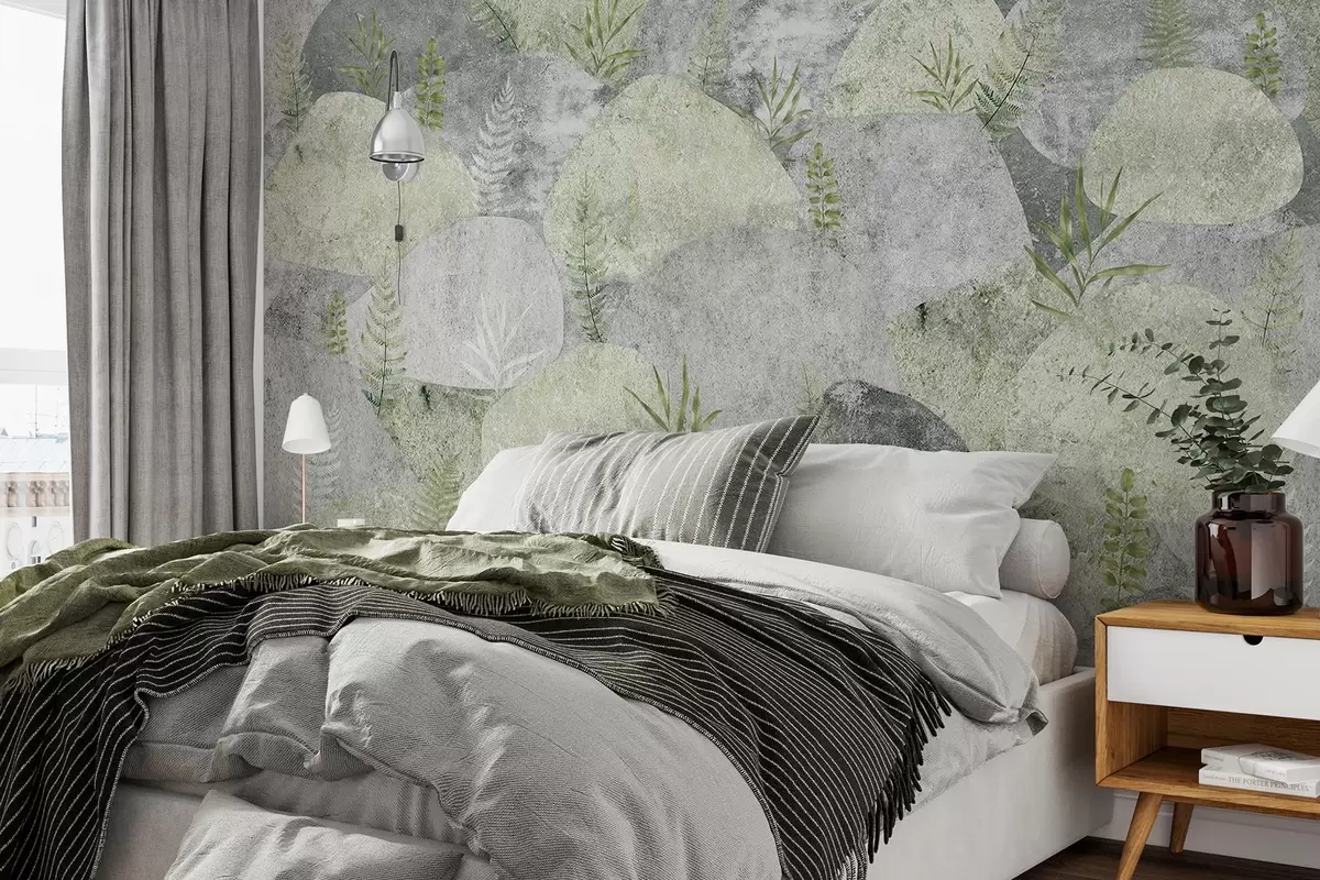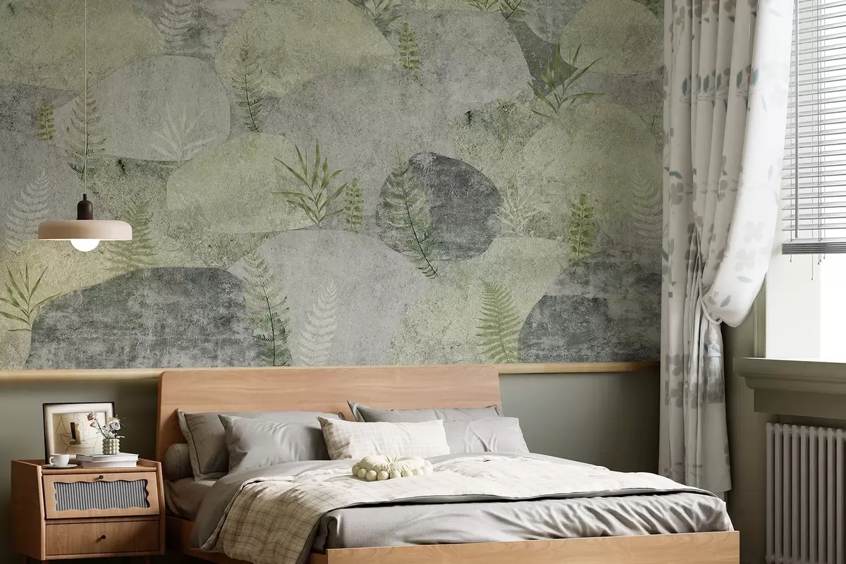 Papier peint Pierres avec plantes, fougères, style nordique, rustique, couleurs grises et vertes N° w04064v2