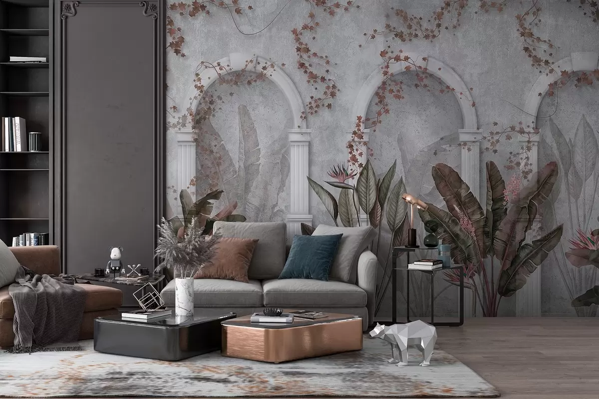 Papier peint Mur en béton avec arches et plantes tropicales, florales, couleurs bordeaux N° w04065v1