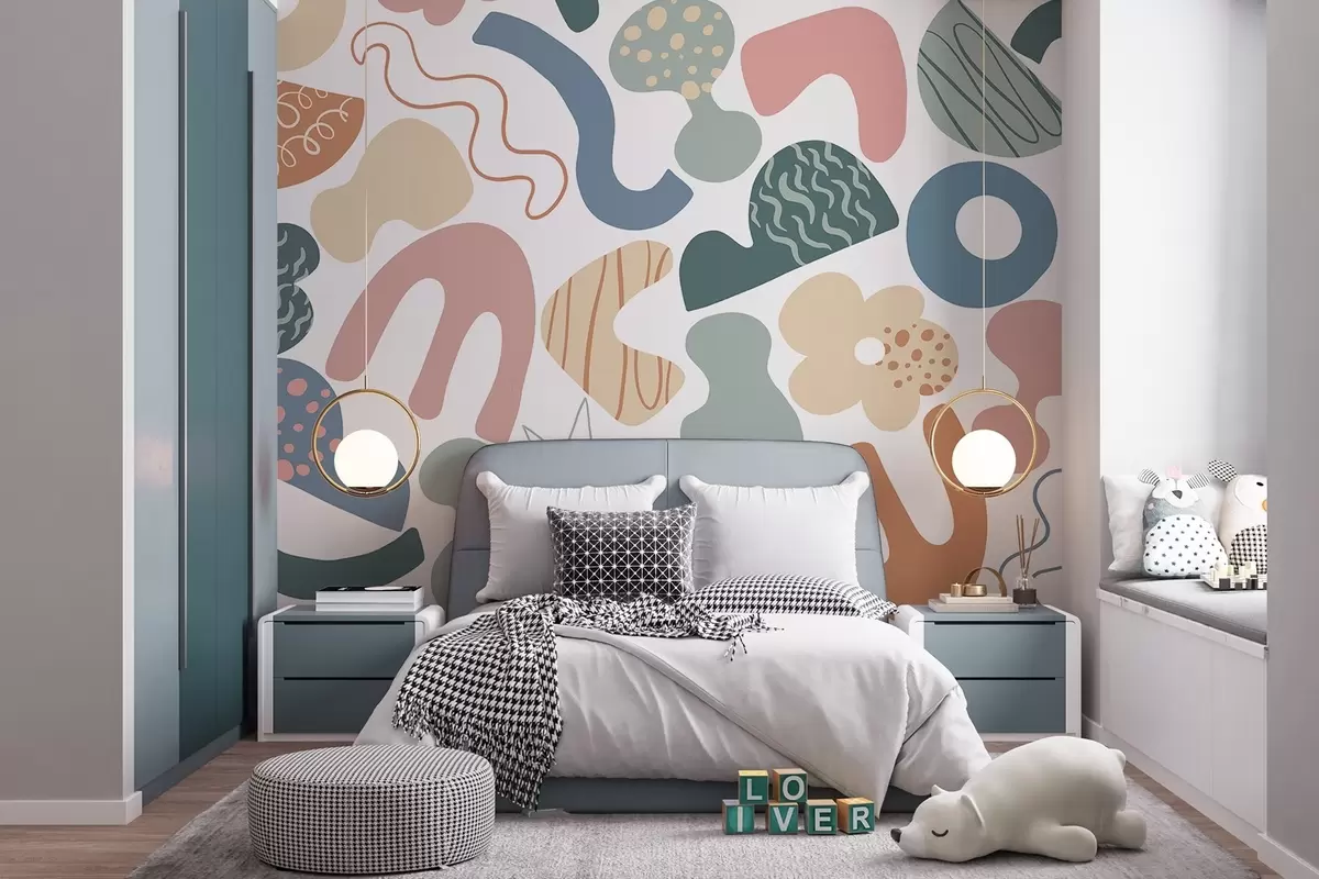 Papier peint Figures géométriques avec dessin de gribouillis, juvénile, vert, rose, bleu N° w04068v2