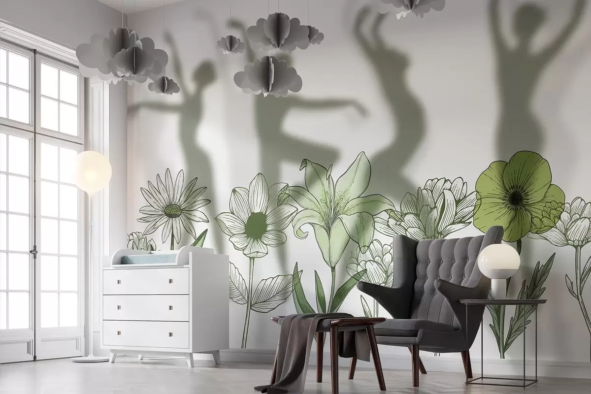 Papier peint Silhouettes de ballerines, fleurs rustiques, dessin au trait, couleurs vertes N° w04069v1
