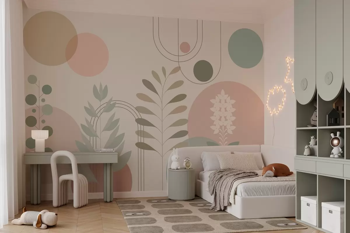 Papier peint abstraction géométrique avec des cercles et des plantes stylisées sur fond crème N° w04070