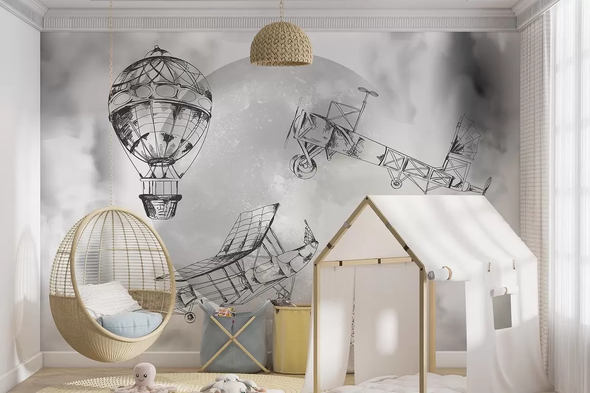 Papier peint Avions rétro sur fond de lune et de nuages N° w04085