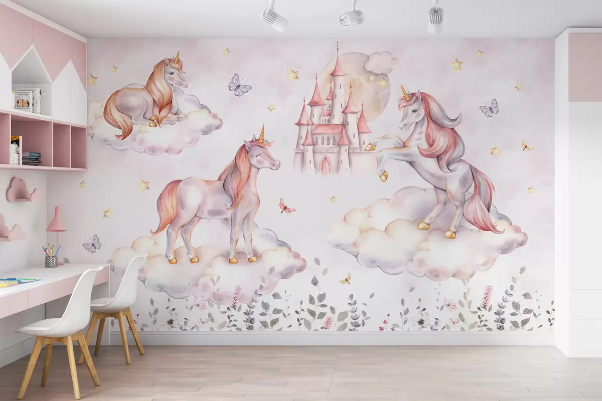 Papier peint Des licornes dans les nuages avec des étoiles, des papillons et des fleurs N° w04165
