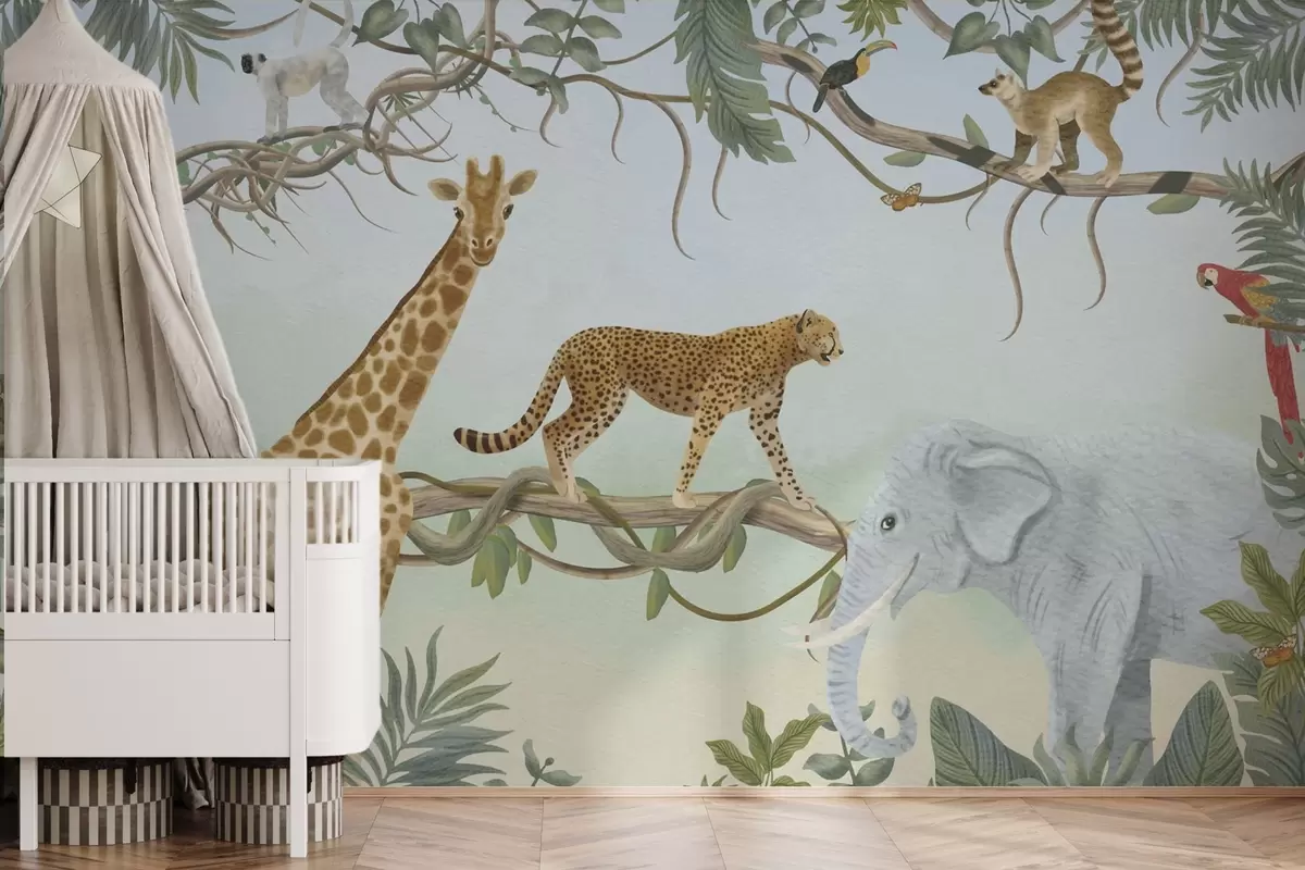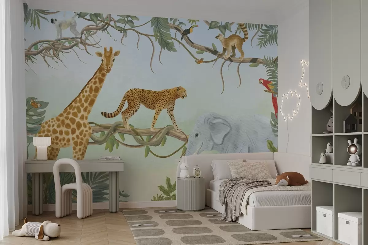 Papier peint Illustration de la jungle avec girafe, guépard et éléphant N° w04194
