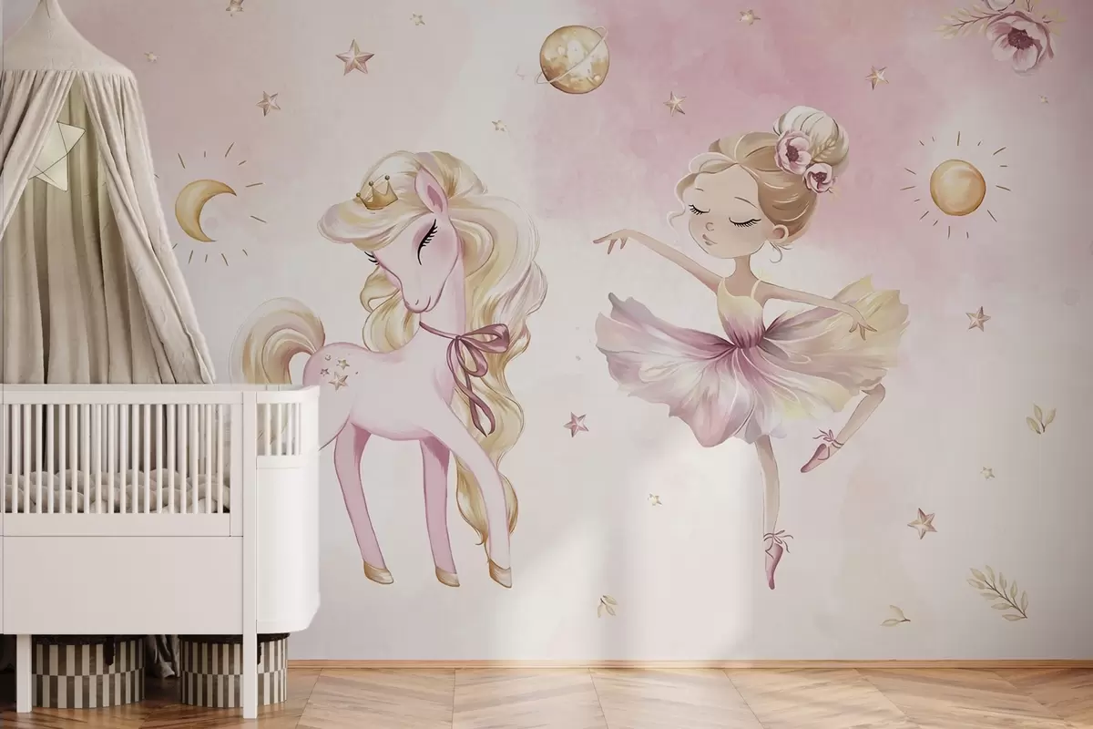 Papier peint Licorne et ballerine dans un conte de fées rose, histoire pour enfants N° w04196