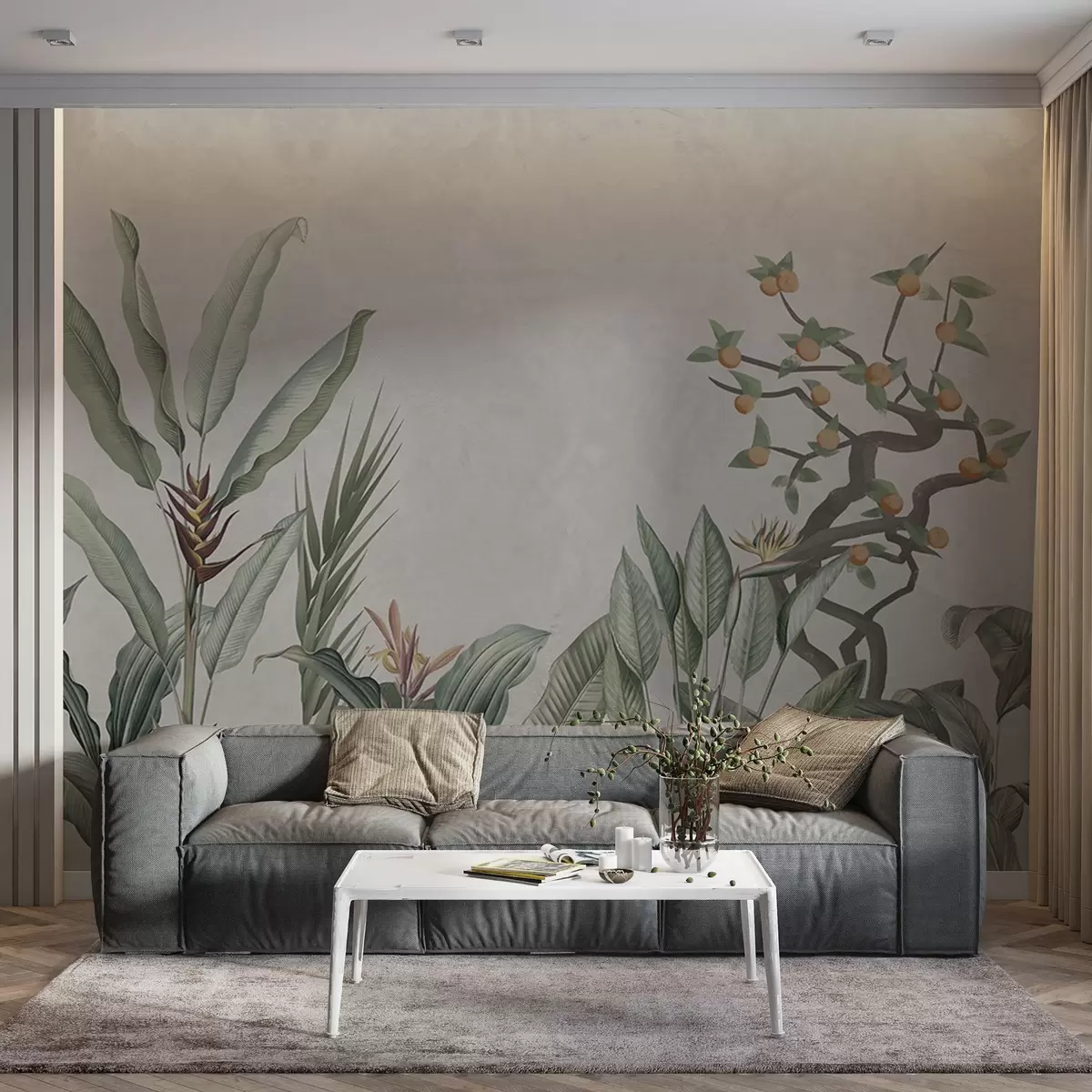 Papier peint Composition tropicale avec des plantes et un arbre sur un fond grisâtre N° w04201v1