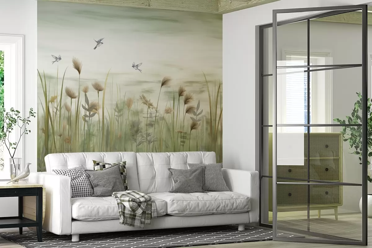 Papier peint Paysage d'herbe avec hirondelles sur fond de ciel doux N° w04258v1