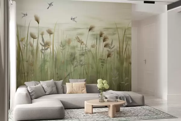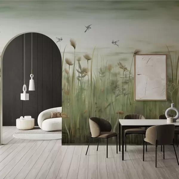 Papier peint Paysage d'herbe avec hirondelles sur fond de ciel doux N° w04258v1
