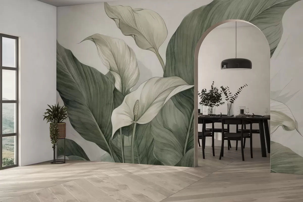 Papier peint Gros plan d'un spathiphyllum en fleurs avec de grandes feuilles N° w04263