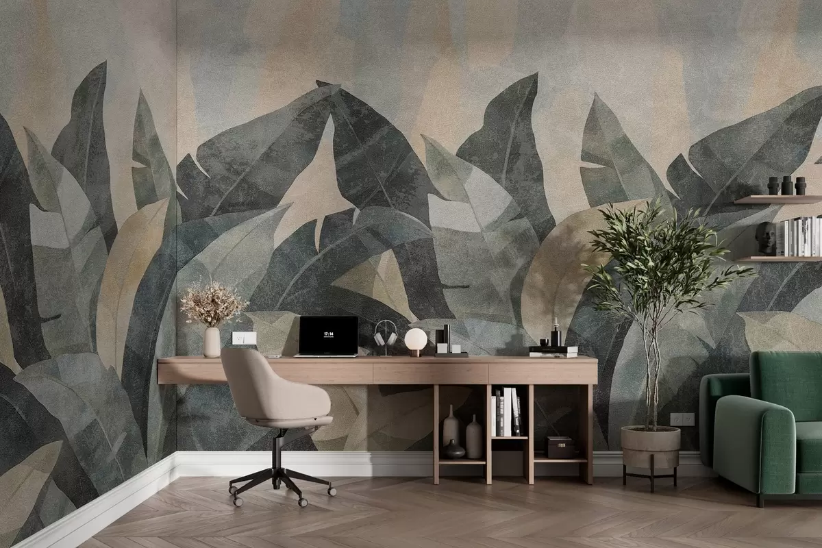 Papier peint feuilles de bananier texturées dans des tons naturels de beige, vert et gris N° w04285
