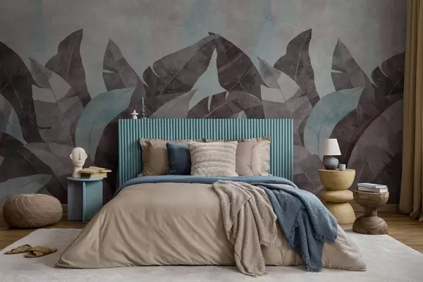 Papier peint feuilles de bananier texturées dans les tons bleu et gris N° w04285v2