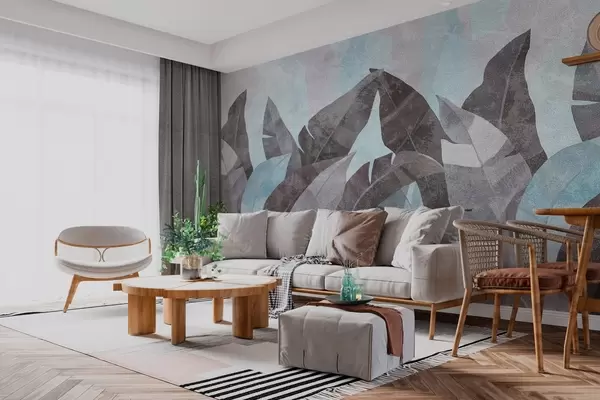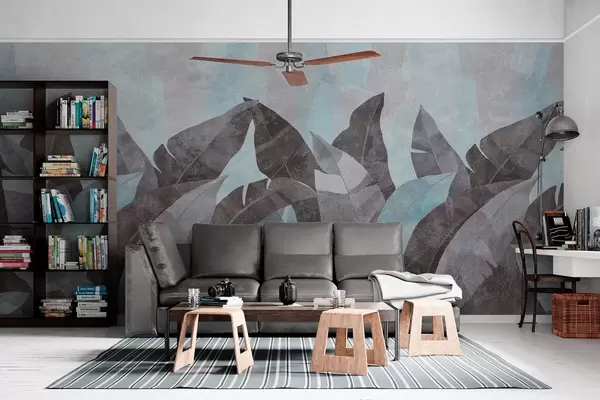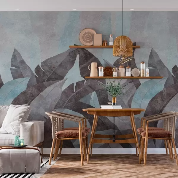Papier peint feuilles de bananier texturées dans les tons bleu et gris N° w04285v2