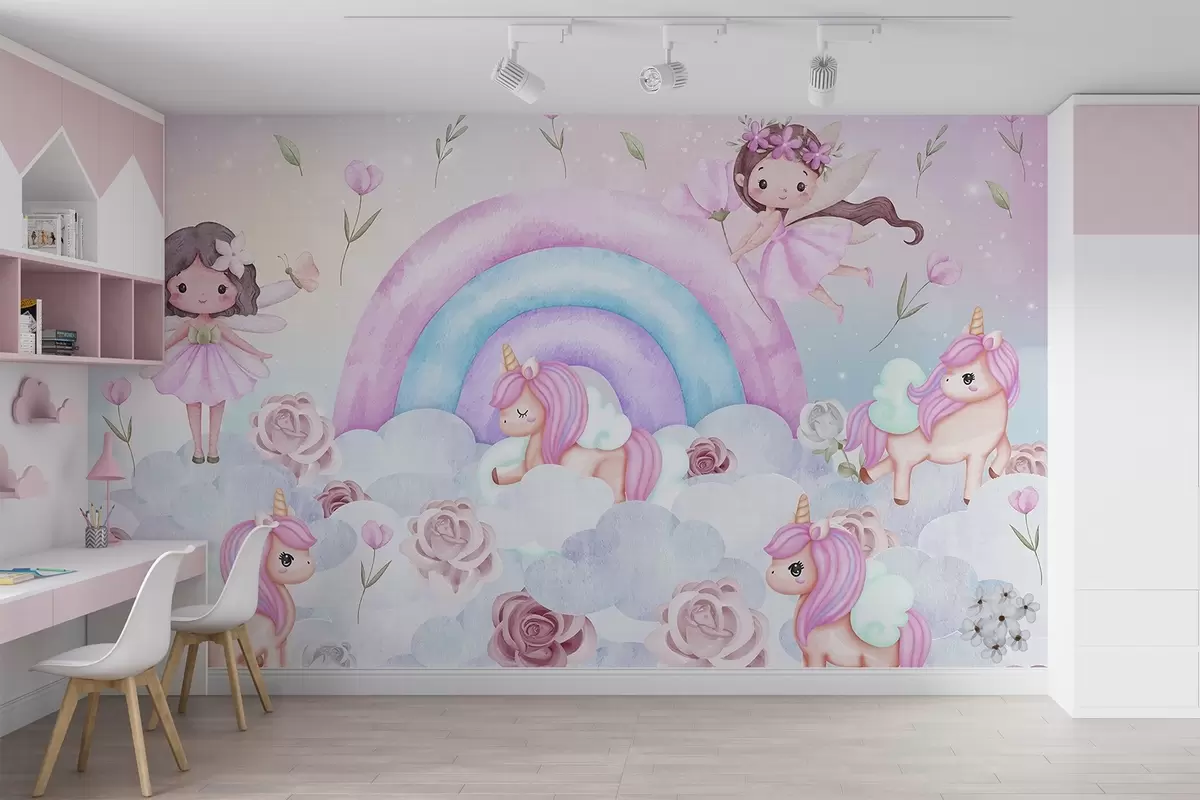 Papier peint Fées et licornes parmi les nuages et les arcs-en-ciel N° w04371