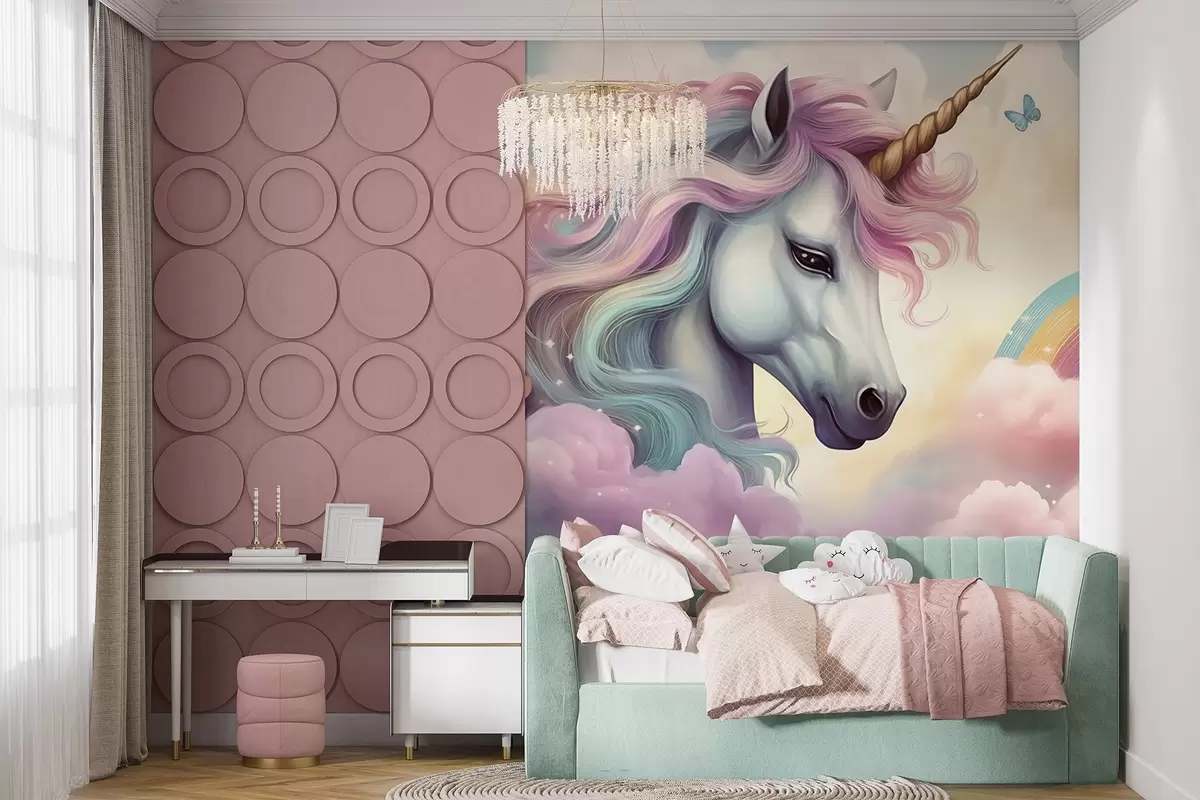 Papier peint Licorne dans un ciel nuageux avec un arc-en-ciel N° w04372
