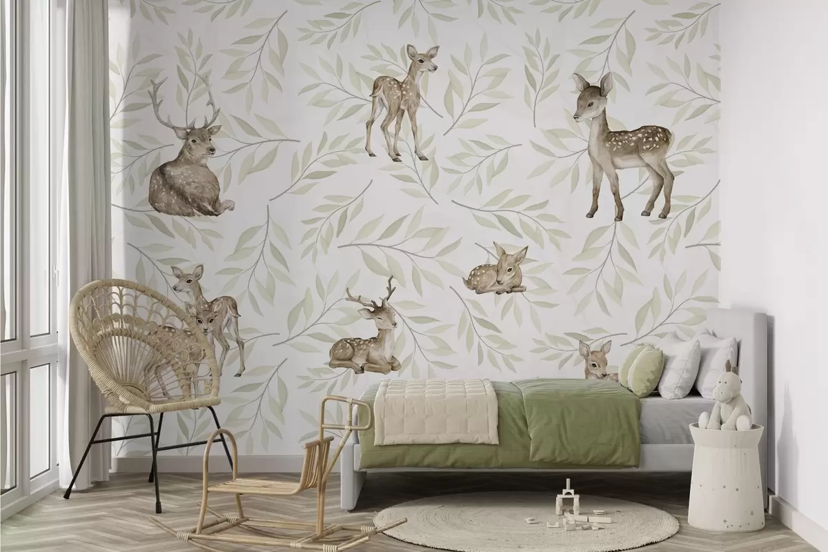 Papier peint Fauves parmi des feuilles verdâtres sur fond blanc N° w04461v1