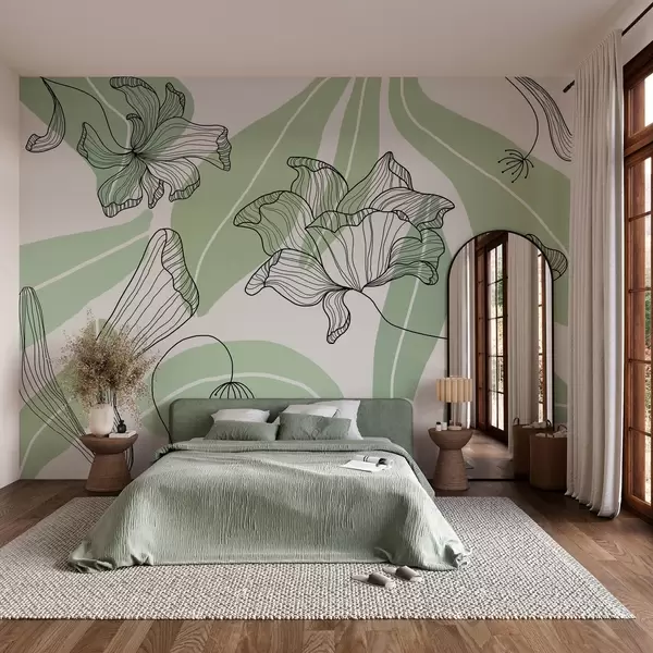 Papier peint feuilles et fleurs abstraites dans les tons verts N° w04499v1
