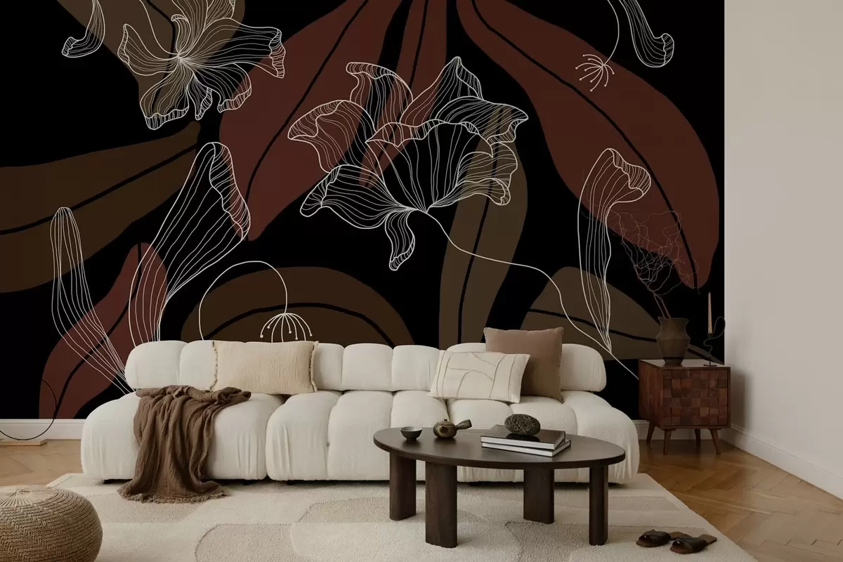 Papier peint feuilles et fleurs abstraites dans des tons poudrés et beiges sur fond sombre N° w04499v3