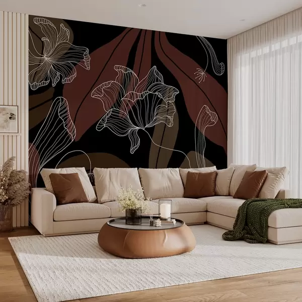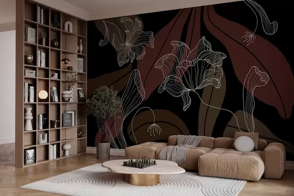 Papier peint feuilles et fleurs abstraites dans des tons poudrés et beiges sur fond sombre N° w04499v3