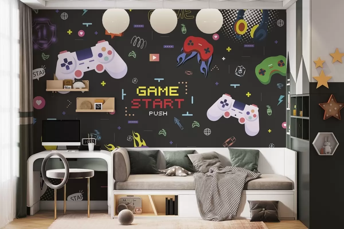 Papier peint Motif gamer lumineux avec consoles et texte pixélisé N° w04581