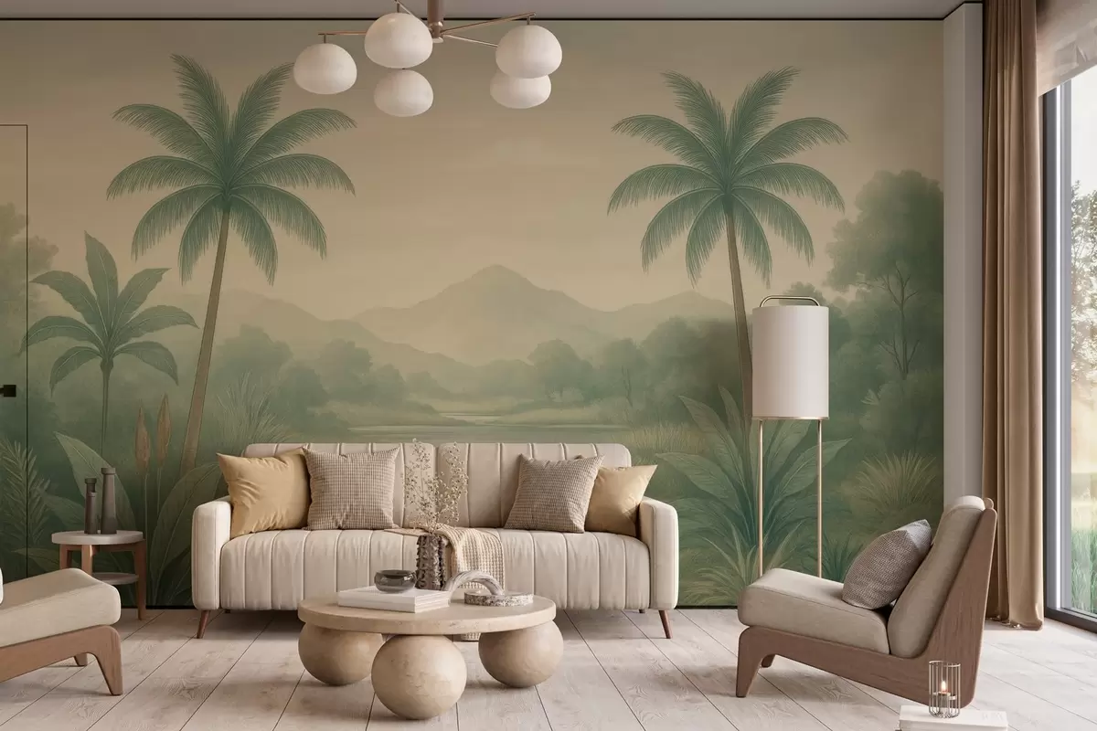 Papier peint paysage tropical avec des palmiers et une rivière N° w04623