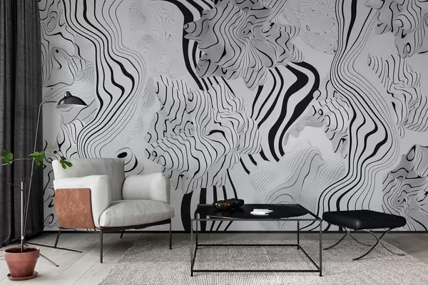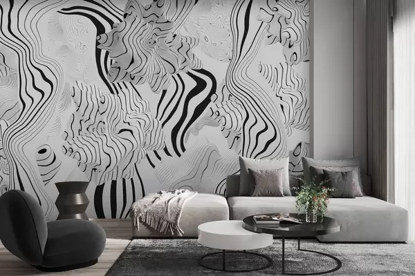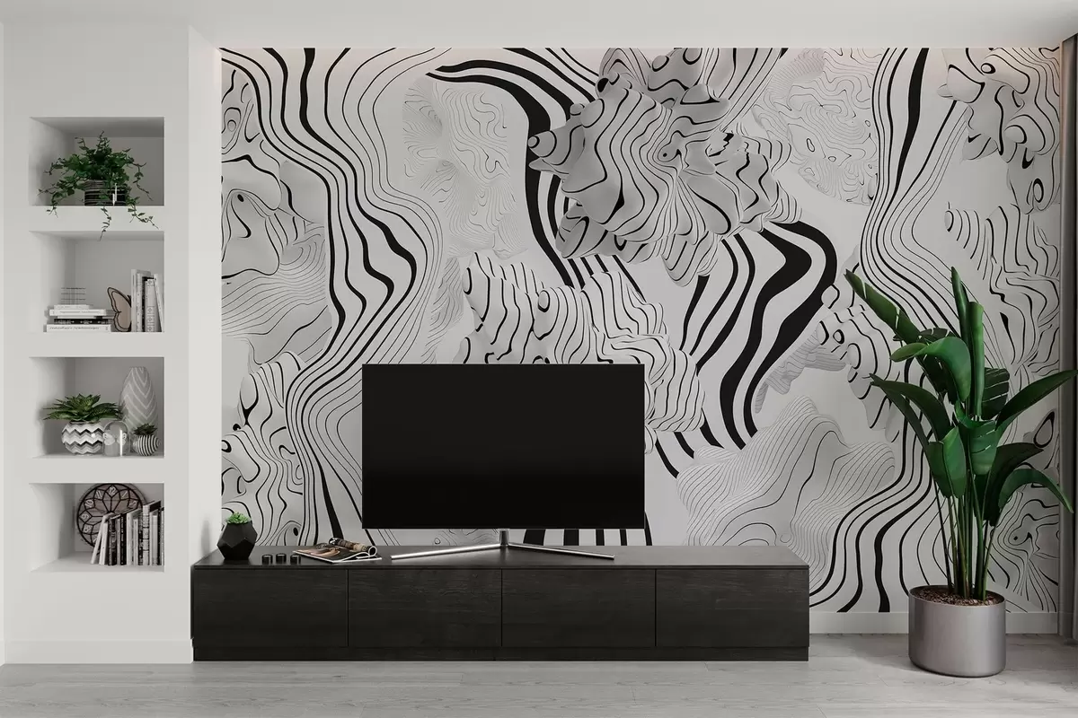 Papier peint formes organiques abstraites en 3D dans des tons blancs et gris avec des rayures noires N° w04627