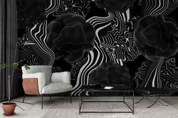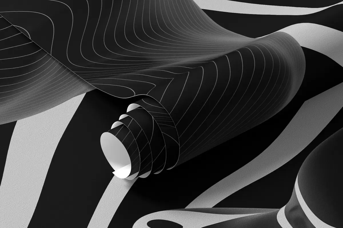 Papier peint formes organiques abstraites en 3D dans des tons noirs avec des rayures blanches N° w04628