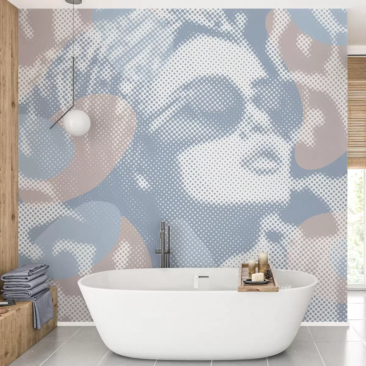 Papier peint portrait d'une femme sur fond léopard dans un style pointillé dans les tons bleus N° w04630v1