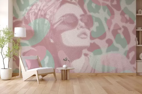 Papier peint portrait d'une femme sur fond léopard dans un style pointillé dans des tons roses et verts N° w04630v2