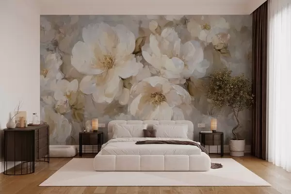 Papier peint grandes fleurs dans les tons blancs et beiges dans le style de la peinture à l'huile N° w04633