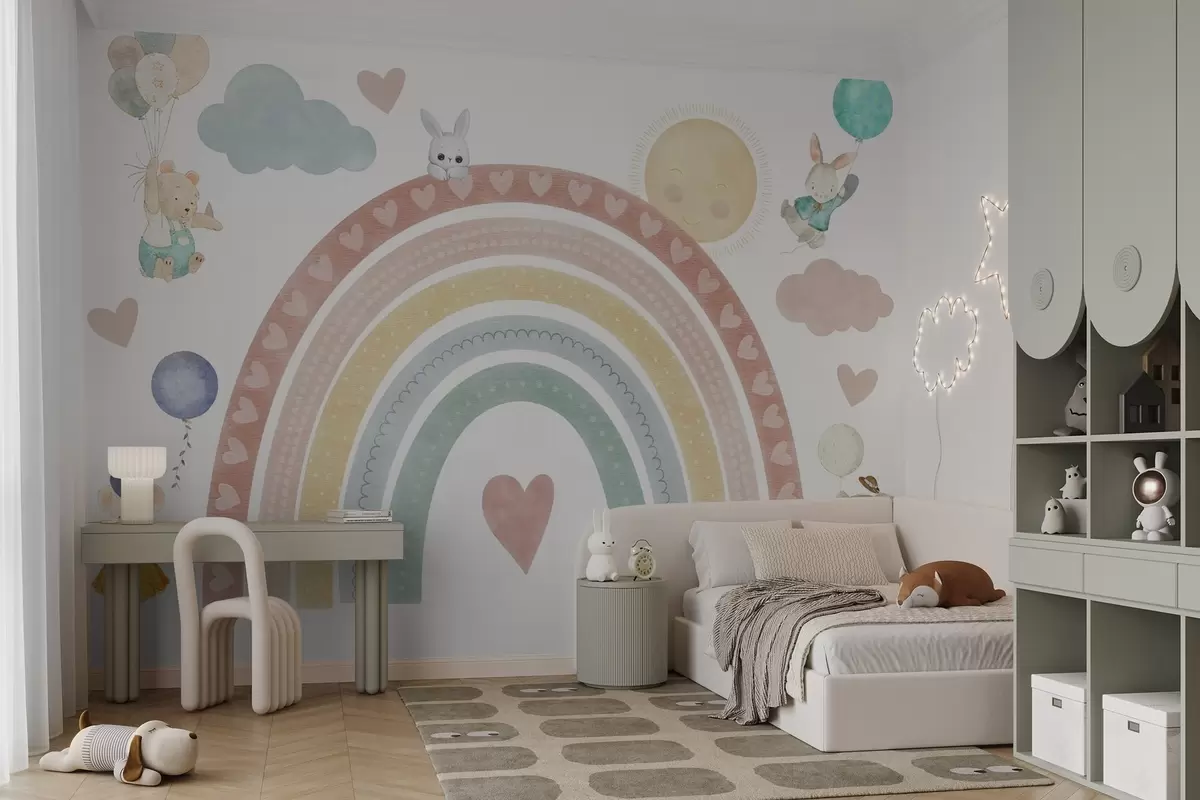 Papier peint Arc-en-ciel pastel avec des cœurs, des animaux et des ballons N° w04681