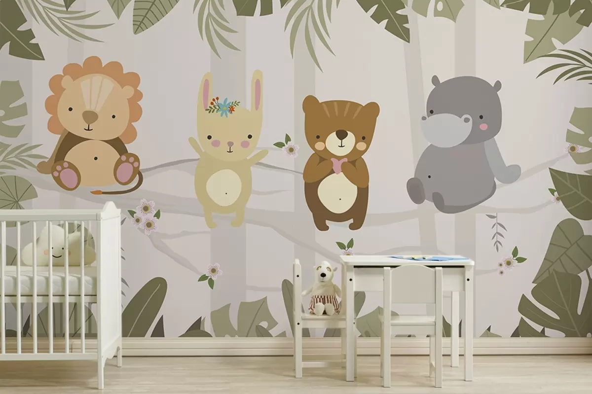 Papier peint Adorable lion, lapin, ours et hippopotame parmi les feuilles N° w04682