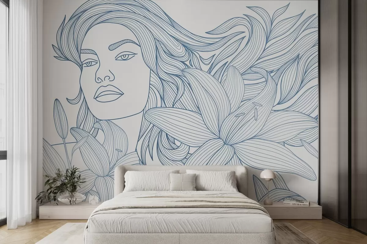 Papier peint Portrait d'une jeune fille dans des nuances de bleu et de fleurs de lys N° w04689v2