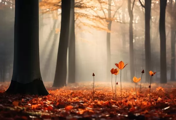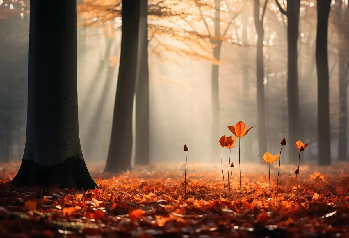 Papier peint Forêt automnale baignée de rayons de soleil et feuillage lumineux N° w04710