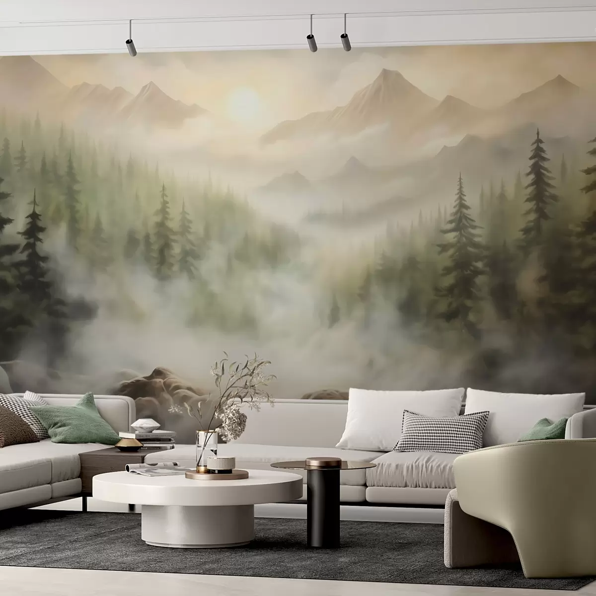 Papier peint Forêt dans le brouillard avec les montagnes en arrière-plan N° w04730